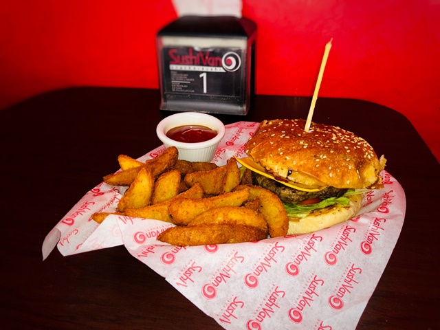 Carne a la parrilla (150 g) o pechuga de pollo (150 g), lechuga, tomate, cebolla, y queso americano, Acompañada de papas fritas a la francesa o sazonadas. (150 g)